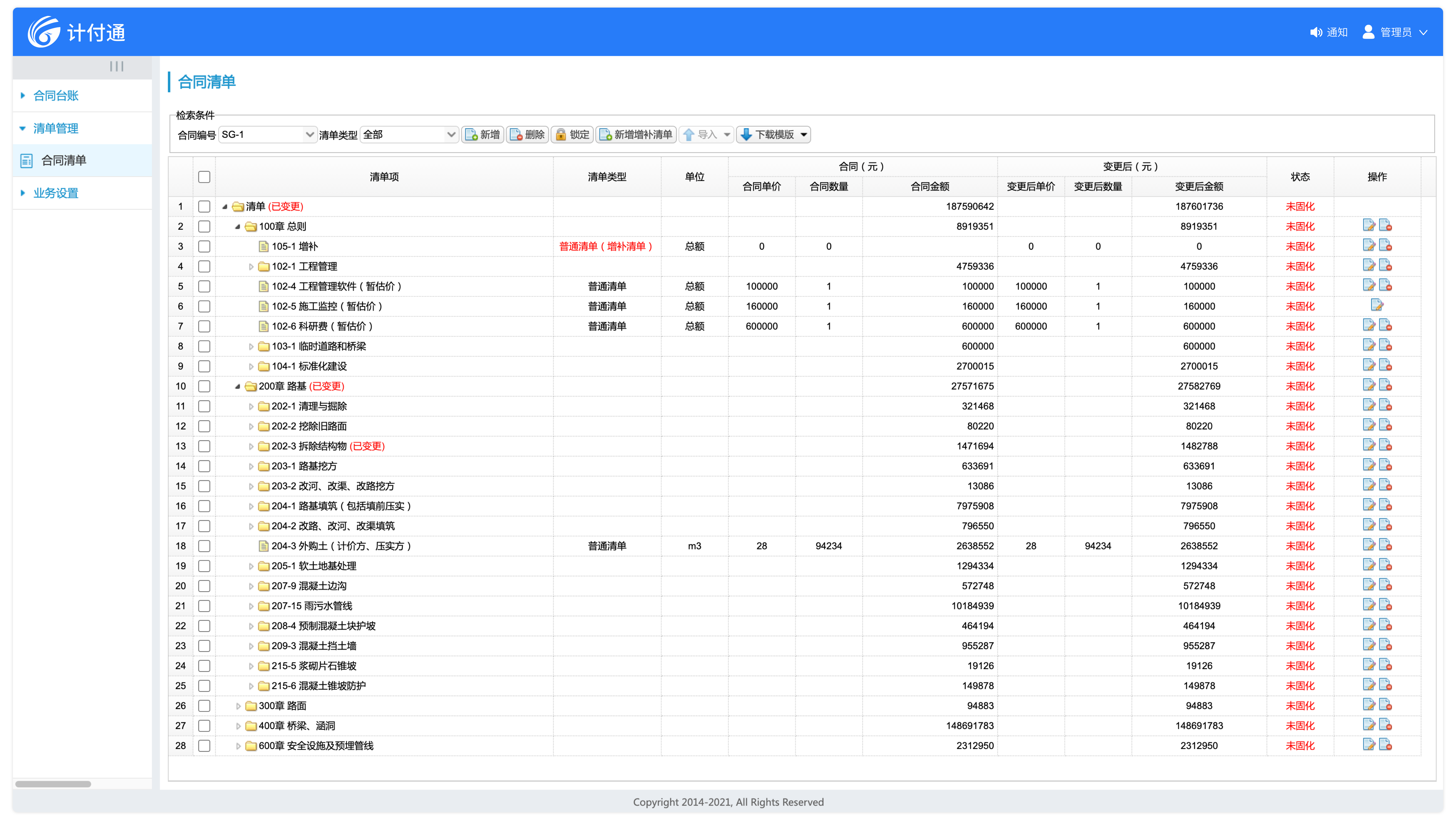合同清單支持公路、房建、市政、水運(yùn)、航道等不同項(xiàng)目類型的工程量清單,提供標(biāo)準(zhǔn)模板,支持清單導(dǎo)入導(dǎo)出。