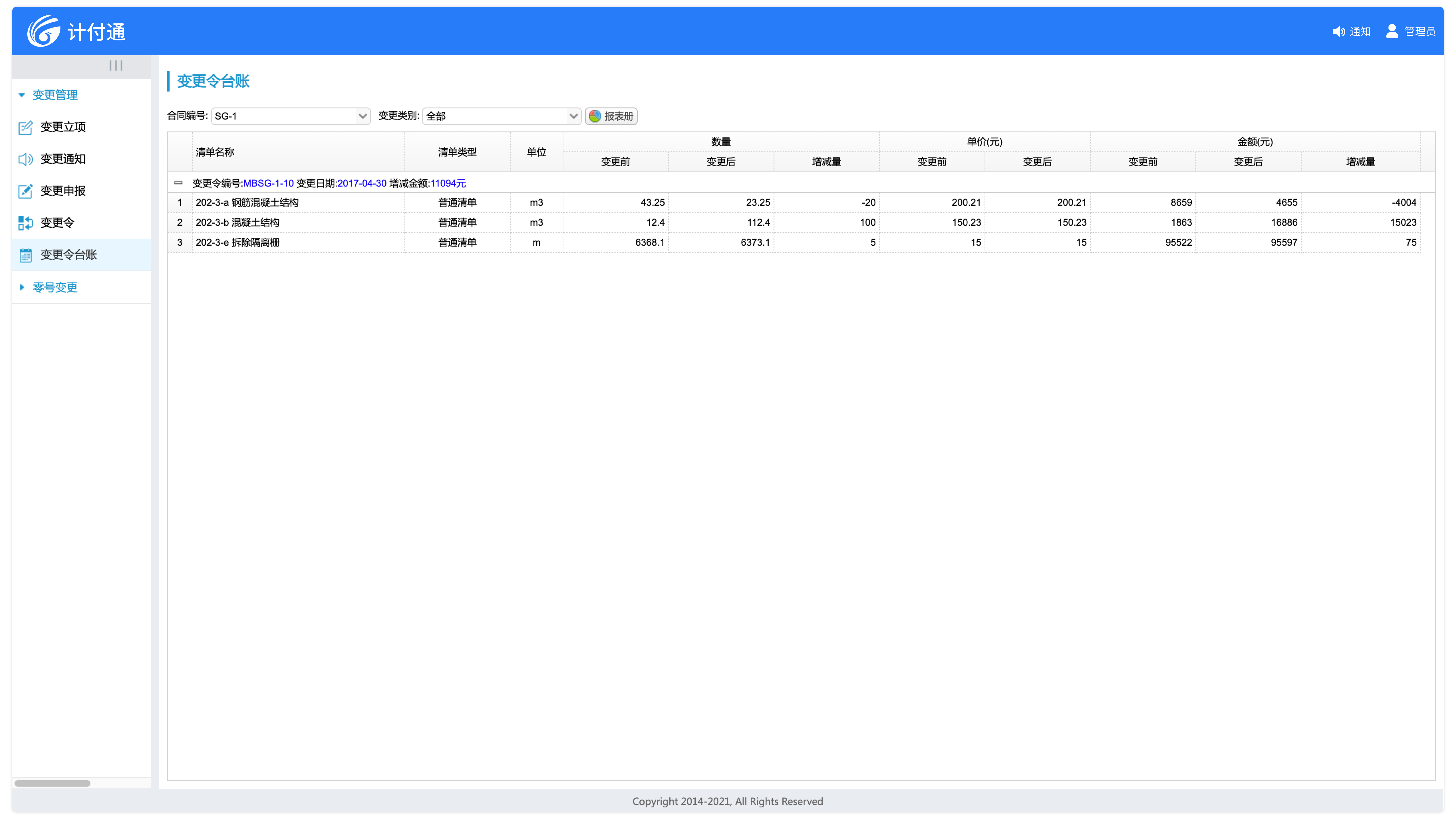 變更令生效后,變更數(shù)據(jù)實(shí)時同步至合同清單,作為變更計(jì)量的依據(jù)。