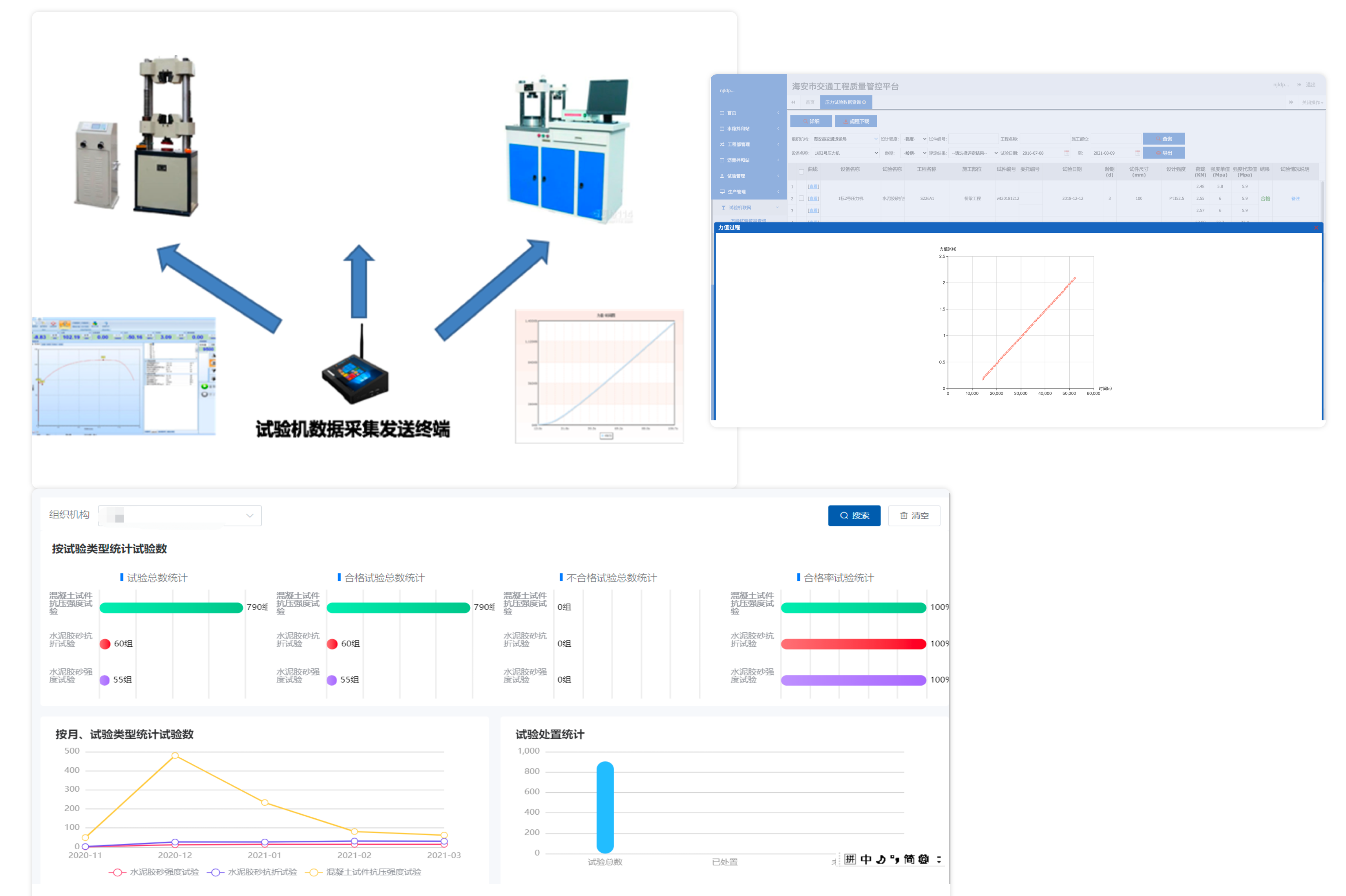 在試驗(yàn)機(jī)安裝智能數(shù)據(jù)采集終端,全自動化采集試驗(yàn)機(jī)的試驗(yàn)數(shù)據(jù),按照規(guī)范要求進(jìn)行匯總、統(tǒng)計(jì)分析,管理人員可以及時的